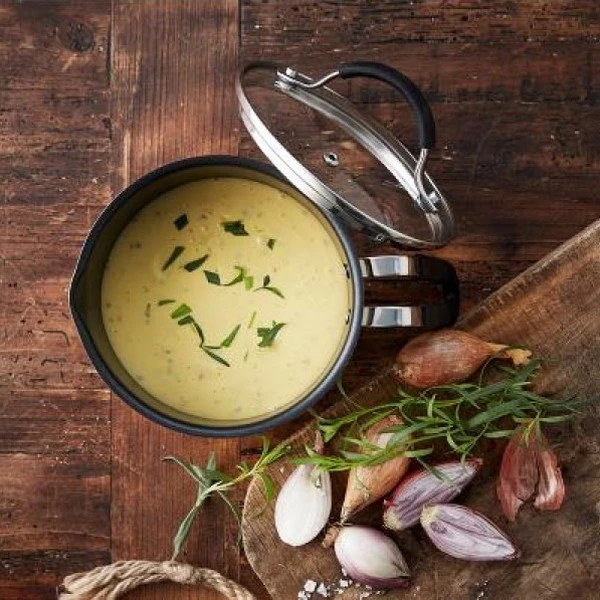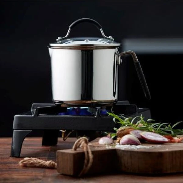 Det smarte ved denne sovsegryde er at håndtaget sidder på samme måde som på en almindelig kande, dette betyder at man har et godt tag i gryden når man tilbereder saucen.