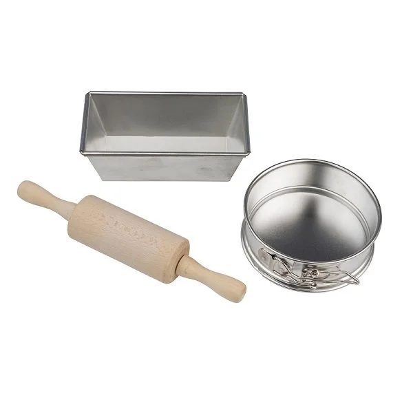 Dette børnebagesæt fra Patisse indeholder 3 dele. – En kagerulle, en springform og en brødform. I børnestørrelser selvfølgelig!