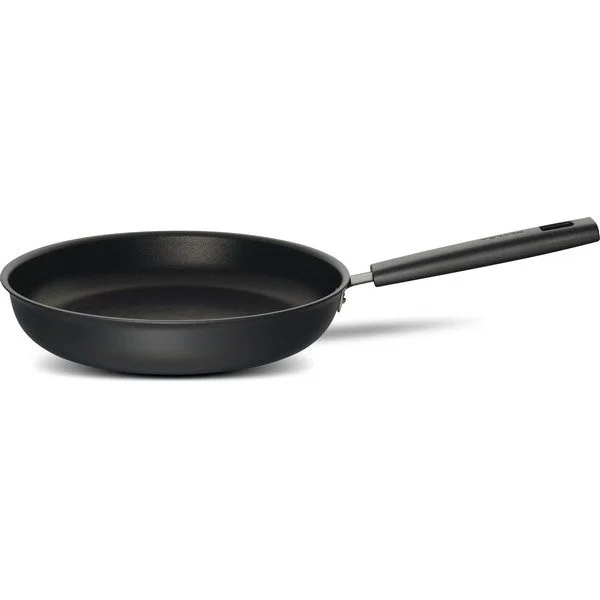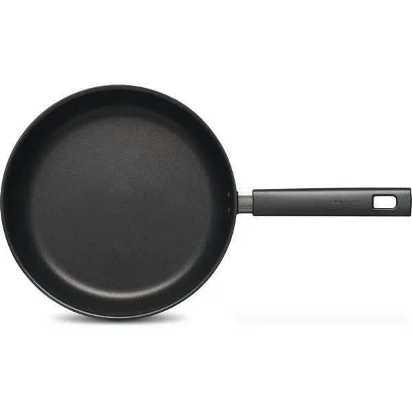 Fiskars hard face stegepande 28 cm har en stærk belægning som tåler metalredskaber (dog IKKE skarpe genstande). Den tykke bund leder og fordeler varmen effektivt, så varmefordelingen bliver jævn og ensartet i hele stegepanden. Håndtaget i bakelit bliver ikke varm og har en god længde, så det ligger rigtig godt i hånden.