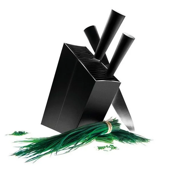 Eva Solo skrå knivblok i sort med fleksible lameller, som kan rumme flere forskellige redskaber. Knivblokken’s ydre er lavet af aluminium og det elegante og praktiske design, har vundet flere priser. Lamellerne kan tages ud og kan rengøres i opvaskemaskine. Knivblokken er rigtig god til både at huse dine skarpe knive og andre redskaber.