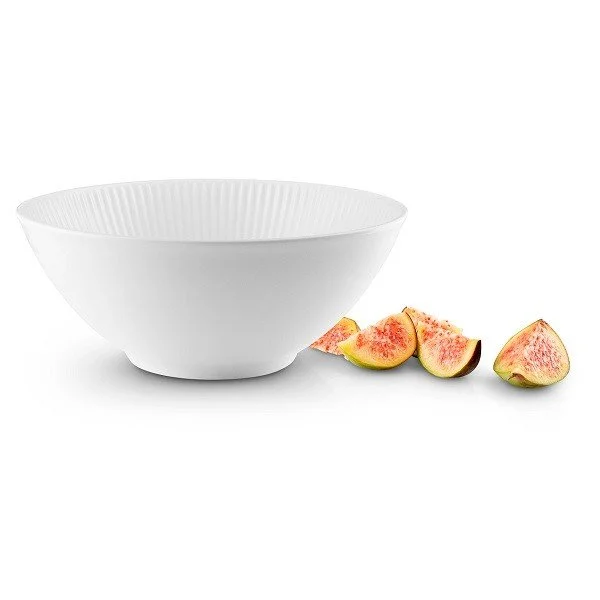 Skålen passer sammen med resten af Eva Trio’s stel-serie; Legio Nova. Men den skiller sig dog alligevel lidt ud fra de resterende skåle i serien. Legio Nova er kendetegnet ved de ikoniske riller langs kanten af tallerkenerne og på skålene er rillerne markeret op ad siderne. På denne skål er de velkendte riller dog placeret inde i skålen, hvilket giver den et lidt andet udtryk. Den giver en fin kontrast til resten af stel-serien når delene bliver sat på spisebordet sammen. Derudover er skålene lette at stable i hinanden inde i køkkenskabet, så de ikke fylder alt for meget, når de ikke er i brug.