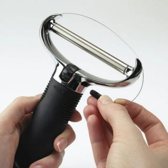 En ergonomisk ostehøvl er helt essentiel til dig, som mangler en robust osteskærer med et behageligt greb. Ostehøvlen fra OXO Good Grips har mange gode egenskaber og er nem at skifte strenge på. Osteskæreren kan nemt skære igennem både hårde og bløde skæreoste. Og tykkelsen på oste – skiverne bestemmer du selvfølgelig selv. – Blot ved at justere hældningen af håndleddet mens man skærer, kan man bestemme tykkelsen på skiverne.