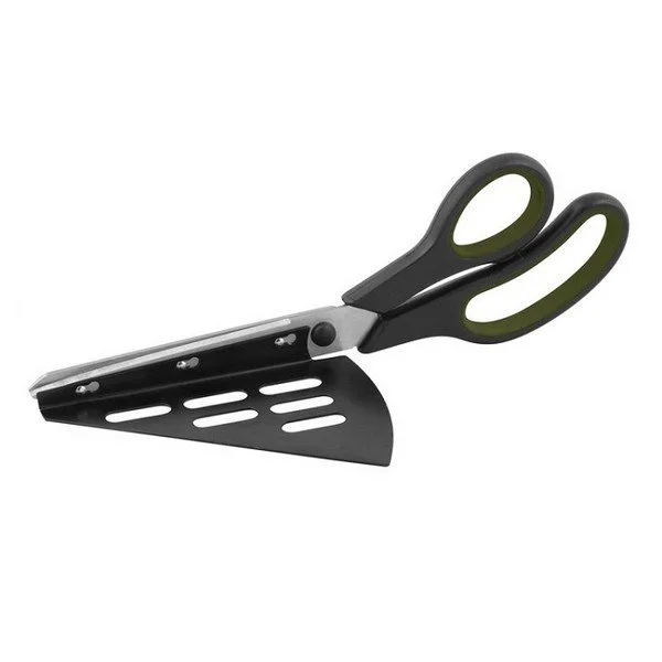 Pizzasaksen ser ud som en almindelig saks, dog er klingerne en anelse kraftigere. På den ene klinge sidder en “palet” som holder pizzaslicen imens du klipper, og som du bagefter bruger til at servere slicen med.
