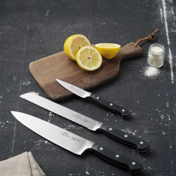 Sabatier knivsæt med 3 knive, sættet består af 1 kokkekniv 20 cm. 1 brødsav 20 cm. og 1 urtekniv 9 cm. Knivene er smedede, har en god balance og ligger godt i hånden.