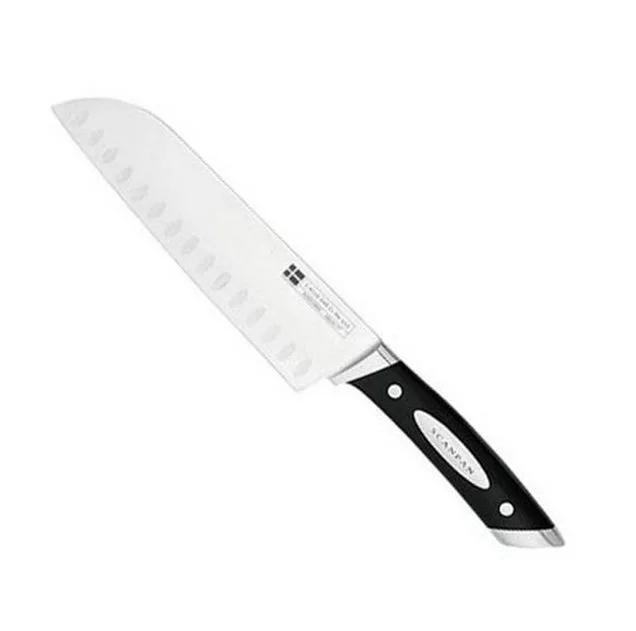12,5 cm Scanpan Classic Santoku grøntsagskniv – Knivbladets tunge kant og luftskær gør det perfekt til at tynde skiver og bittesmå tern. Individuel hårdhedstest efter Rockwell®-metoden, hårdhed 57. Kniven kan gå i opvaskemaskinen.